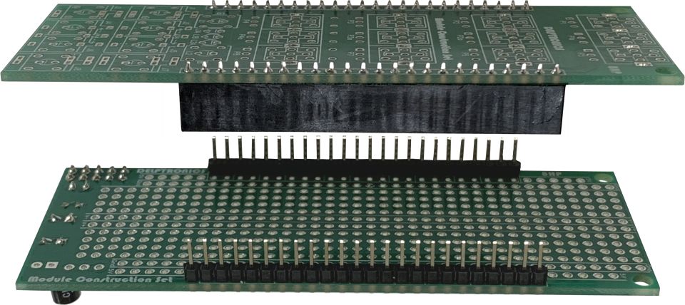 With the Construction Set, a module consists of two circuit boards connected together by male and female headers. The control board has a flexible grid layout that can accommodate up to 12 controls (pots, switches, pushbuttons, LEDs), and up to 8 jacks. The component board has a familiar layout similar to a protoboard or solderless breadboard, and includes a Eurorack power header prewired to the power rails. .